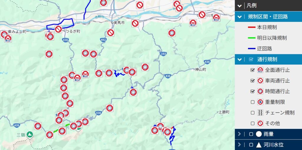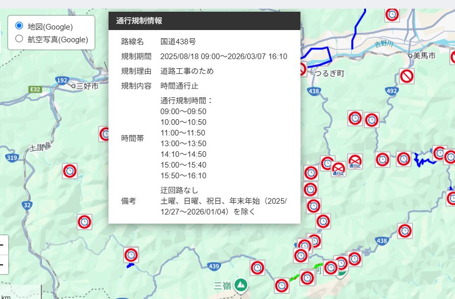国道438号線は時間通行止めのようです。迂回路はありません。(土曜、日曜、祝日、年末年始を除く。