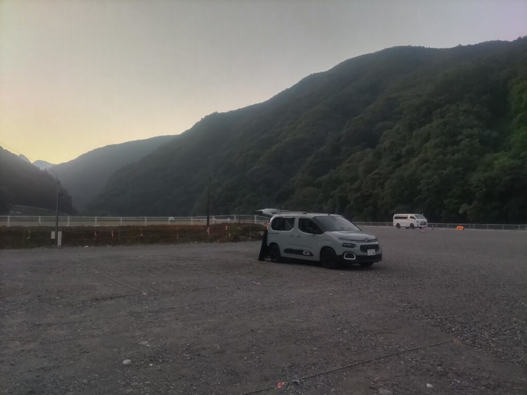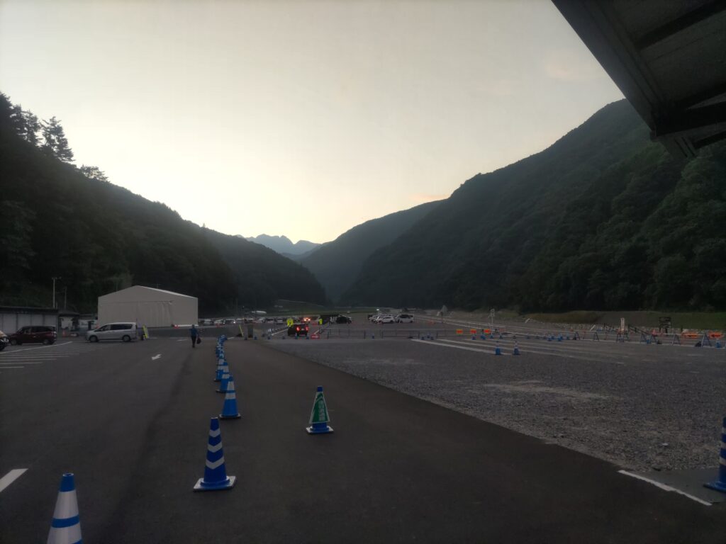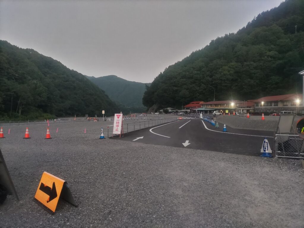 駐車場から仙流荘方面へ。事前確認と場所取りも兼ねて、少し早めに行動。