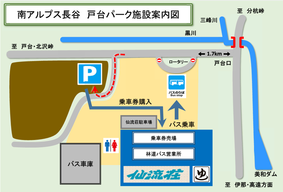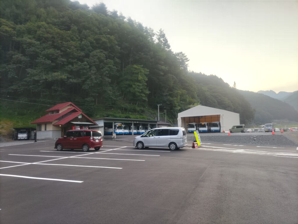 また、敷地内には林道バスのチケット販売窓口やトイレ、案内板が整備されており、初めて訪れる方でも安心。すぐ隣には温泉施設「仙流荘」があり、下山後には入浴や食事で疲れを癒すこともできます。バスの運行期間は例年6月下旬から11月上旬までで、シーズン中は係員が常駐し、天候や登山道の状況なども案内してくれる点も心強いです。
