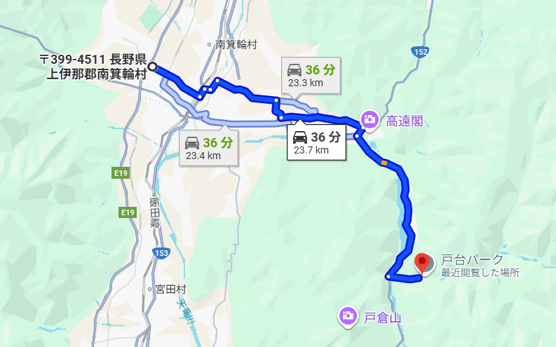 ※国道152号線を南から北上すると難路との情報あり。遠回りでも国道152号線は北から進行しましょう。