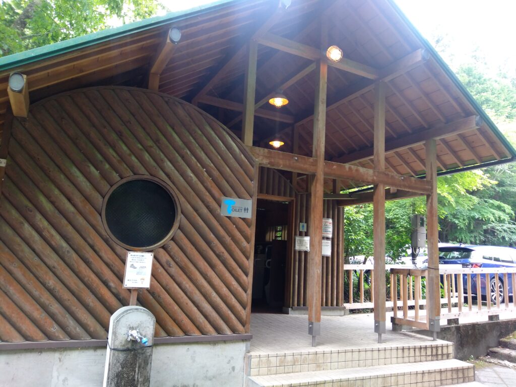 駐車場の真ん中あたりにあるこの建物にトイレがあります。駐車場周辺には自販機はありません。